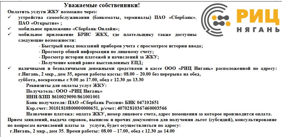 Добрый день! для оплаты жилищных услуг онлайн, можно использовать памятку во вложении. При возникновении вопросов, просим обратиться в РИЦ Нягань, по телефону 57440